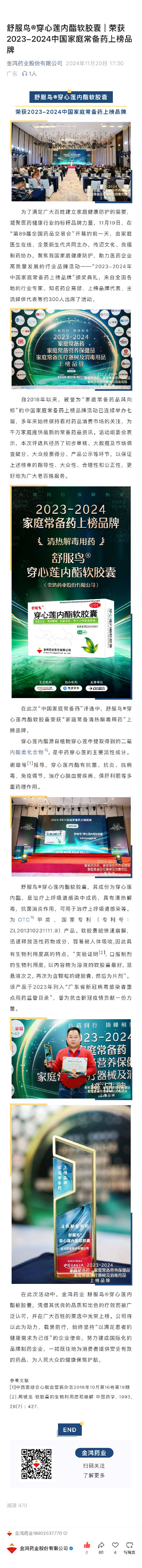舒服鸟®穿心莲内酯软胶囊 | 荣获2023-2024中国家庭常备药上榜品牌